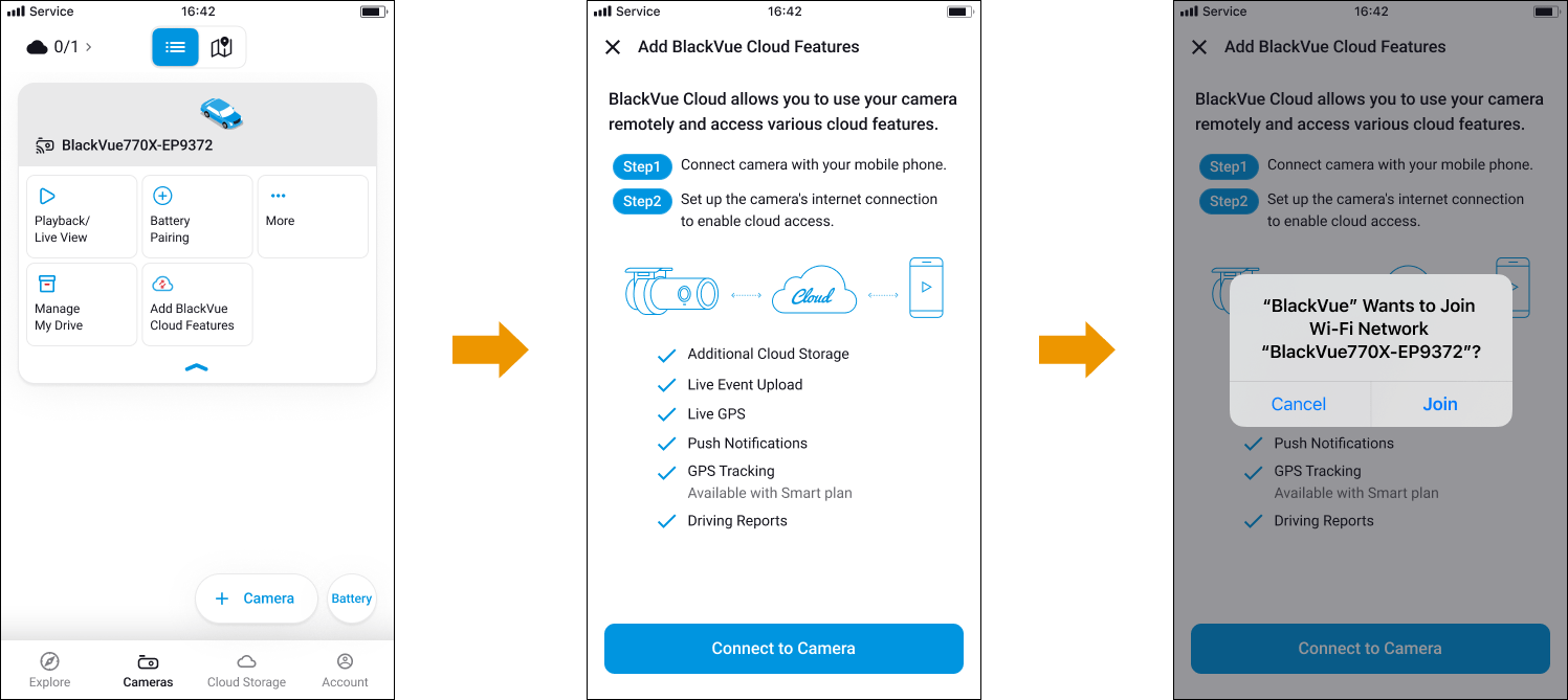 1) After registering the dashcam in the BlackVue app, tap the ‘Add BlackVue Cloud Features’ option on the app Screen.