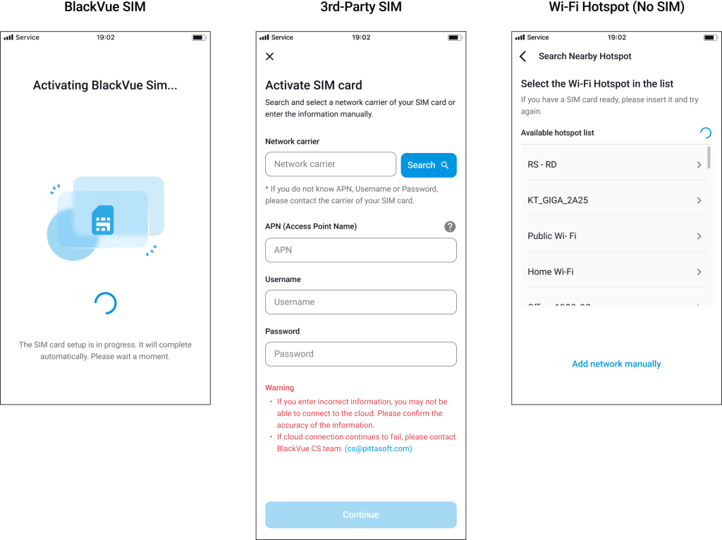 -Case 3: If neither a BlackVue SIM nor a third-party SIM is available, you can connect to a nearby hotspot to use the service.