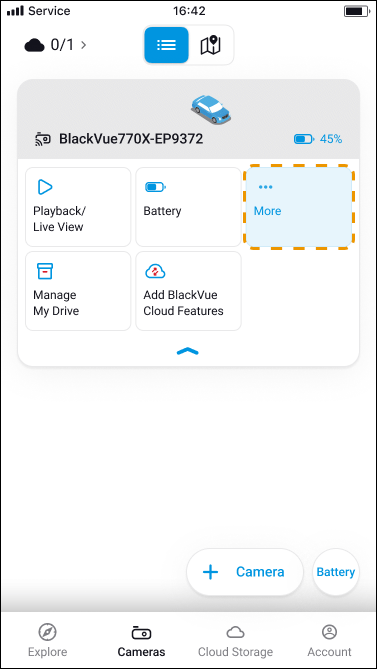 3) Select option above the ‘More’ menu. (If your dashcam is not already added on the app, refer to ‘Connecting your smartphone to BlackVue app’ and add your camera to the list).