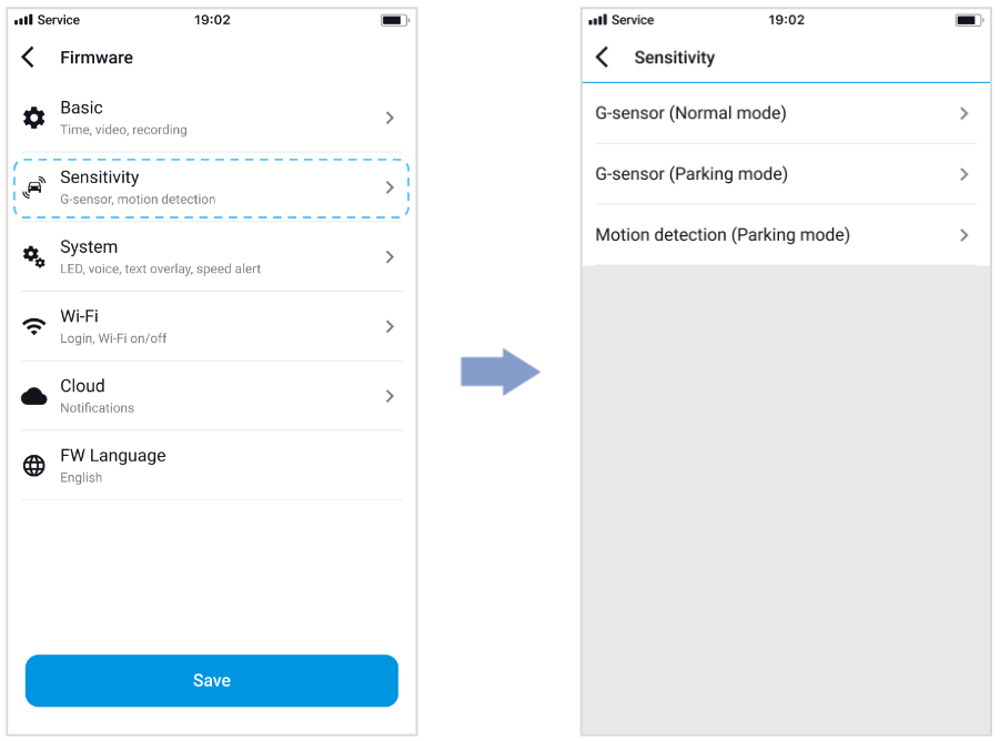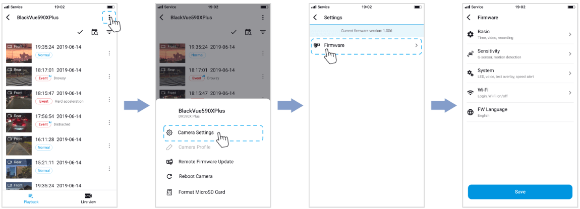 2. Open the BlackVue app. Select Wi-Fi > to access the Firmware settings menu.