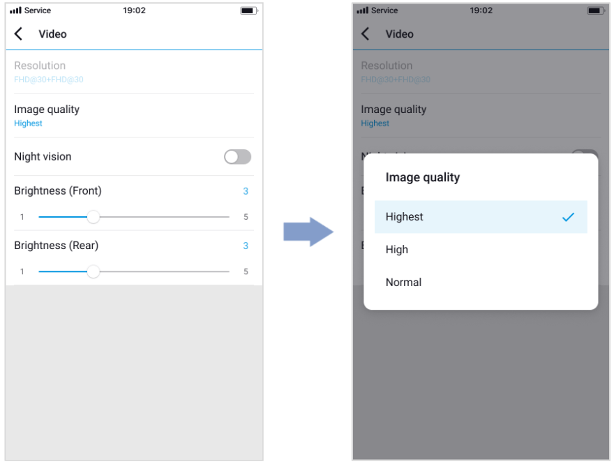 Resolution and frame rate is fixed at “FHD@30 + FHD@30”. This means the front camera records Full HD video at 30 frames per second, and the rear camera records Full HD video at 30 frames per second.