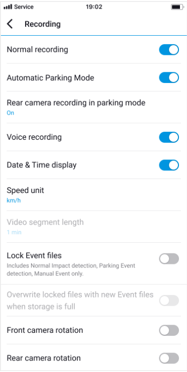 When turned on, the front and rear camera record together. When turned off, the rear camera stops recording 5 minutes after entering parking mode. Rear camera recording restarts when entering